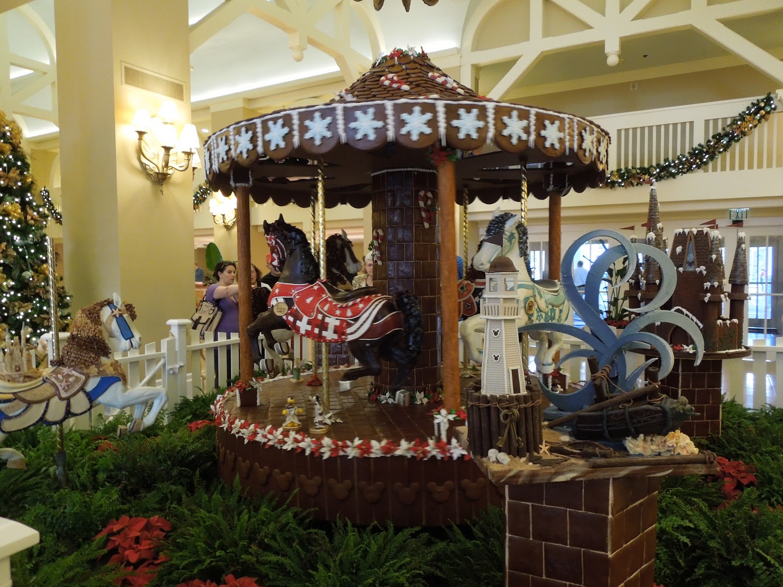 Refreshed, we were ready to hit some more hotels. Our final stops were Epcot’s Yacht Club, Beach Club and Boardwalk Inn. Each hotel had its own Christmas theme. The Yacht Club’s tree was covered with lighthouses and sailboats. At the Beach Club, there was a full-sized working carousel made out of gingerbread, which smelled as good as it looked. The Coney Island-themed Boardwalk Inn was festooned with candy-striped ribbons and featured a gazebo made out of the chocolate.