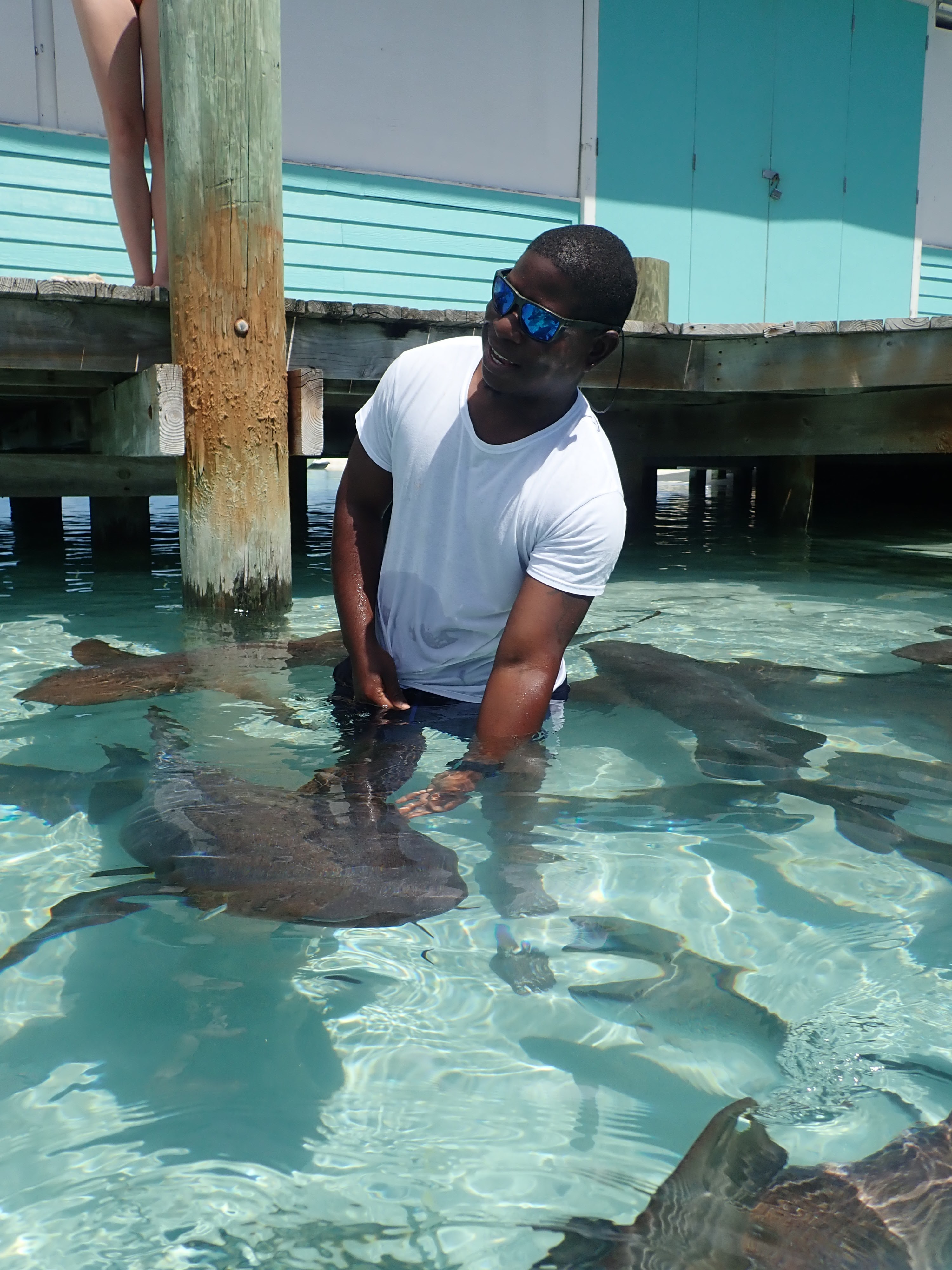 The last time we went to the Exumas, I specifically chose an excursion that did NOT include sharks. I’d seen pictures of tour operators wrestling the sharks, which seemed like a terrible idea for a lot of reasons. But our shark encounter wasn’t like that. It actually reminded me of the sting ray encounters we’ve done. TJ got into the water with us and showed us how to touch the sharks as they swirled around. Their skin was pebbly, kind of like the bottom of a swimming pool. They really were docile, but since their sense of smell was better than their eyesight, we kept our hands out of the way when TJ fed them fish. :-) I wasn’t expecting to like swimming with the sharks so much, but it turned out to be one of my favorite parts of the day. Very cool!
