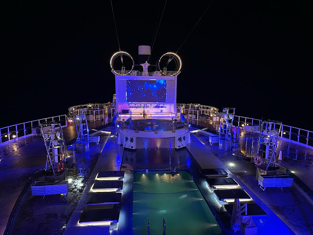 Full and sleepy from a day of fun and sun, we decided not to go back onshore for the beach party. We watched the lighthouse light show from deck and then went back to the cabin. Before going to bed, I stood out on the balcony, looking at the lights on the island and the flashes of distant lightning.